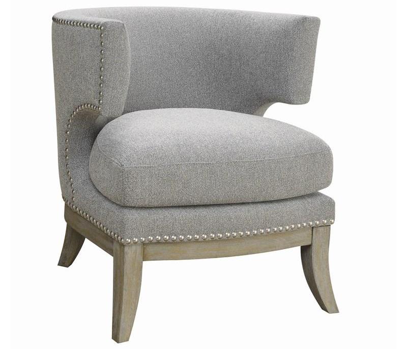 Barrel back design with high arms and cut out along base. Nailheads along the frame. Thick seat cushion. Slightly flared legs and wood trim in weathered grey.