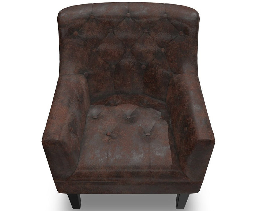 This accent chair with fashion-forward high leg silhouette gives a new meaning to traditional. Diamond button tufting garnishes the back and the plump seat. Distressed fabric with the look of quality leather adds a classic touch that you can appreciate. Mahogany brown color makes it all the more timeless.