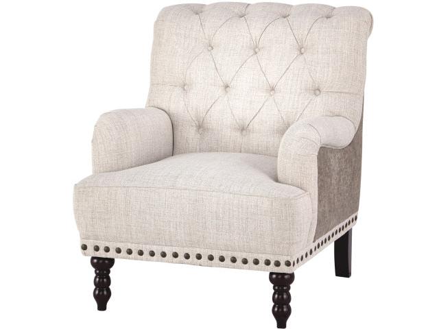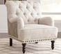 Fresh and sophisticated. This accent chair with button tufting is a classy addition to your home. Inside-out design with linen weave fabric on the seating area and taupe faux leather on the back. Large Nail-head trim ties the look together. Charles of London arms and turned bun feet make this a stylish heirloom piece.
