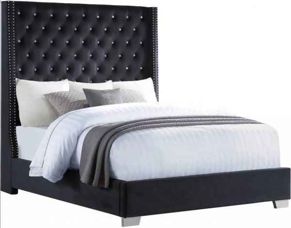 The Michelle Bed allures with the glitz and glam befitting silver screen queens. Exquisite frame's metallic tone channels that Hollywood Regency flair you've been dreaming of. Tall upholstered bed with faux diamond tufting and black textured cover. This price Includes Queen Bed and Queen Promo mattress and box spring.
