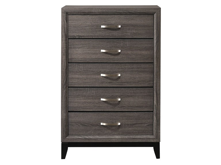 You will surely be impressed by this Akerson queen bedroom set. It features a panel headboard, a low profile footboard, and tapered wooden legs. Finished in grey, this set will easily fit into any home decor.