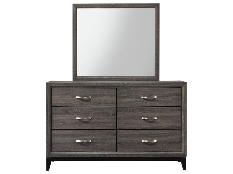 You will surely be impressed by this Akerson queen bedroom set. It features a panel headboard, a low profile footboard, and tapered wooden legs. Finished in grey, this set will easily fit into any home decor. Set includes: Headboard, Footboard, Rails, Dresser, Mirror, & Nightstand. Mattress & Boxspring sold separately Dresser 58.1"...