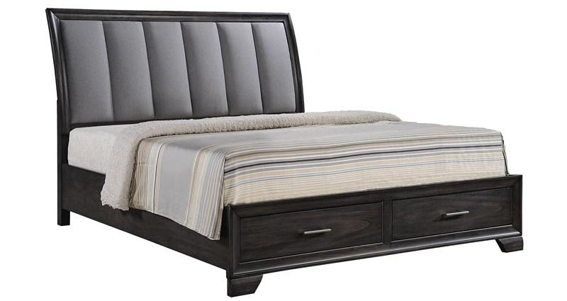 This handsome collection of bedroom furniture will create a bold, contemporary atmosphere in your room. The finish is dark yet vibrant and pairs well with the clean and straight-angled case designs. The highlight of the collection is surely the ultra plush upholstered headboard, which adds some comfort and warmth. Keep your bedroom organized and maximize precious space with footboard storage drawers. Conveniently located under the sleeping surface in lieu of a boxspring, these drawers are perfect for keeping clothes and other bedroom items stored and organized.