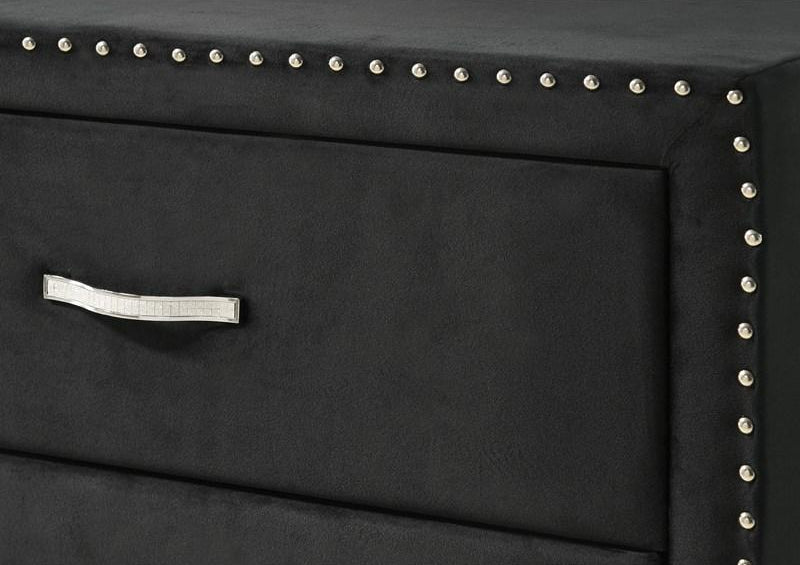 Luxuriously unwind at the end of a long day in this glamorous queen-bedroom set. Fully upholstered in a cool black fabric, your bedroom is given a modern makeover. Adorned with nailhead trim and button-tufting you relax like a golden-age Hollywood star fresh off the red carpet, while headboard wings and scroll top detailing add a vintage charm to an otherwise contemporary piece.