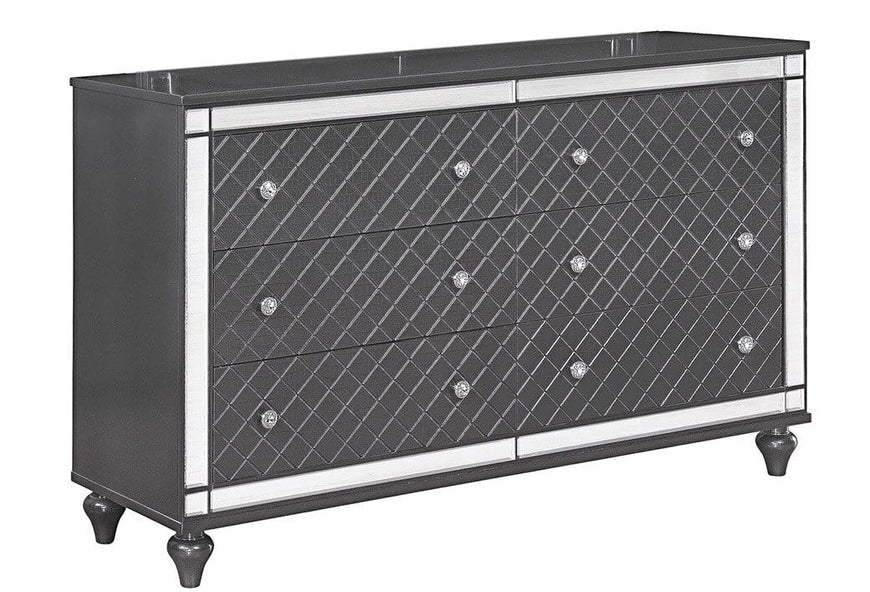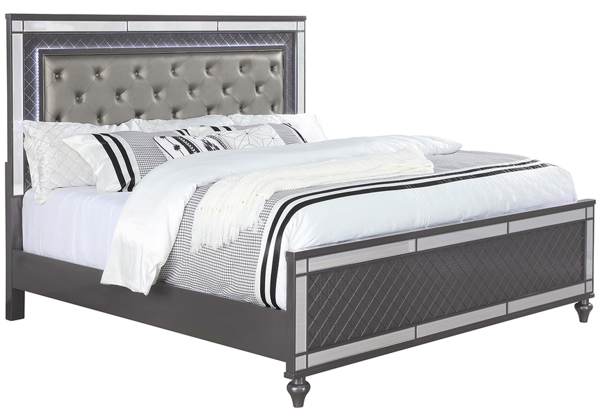 Transform your master bedroom suite into one of luxury with this modern-style panel bed. Each piece is unique and full of glam charm. It has upholstered headboard panels, stout, bracket legs, and matching side rails. Modern styling crystal inlay and decorative details headboard. The Cristian Bedroom Collection is a perfect life partner for any home.