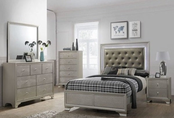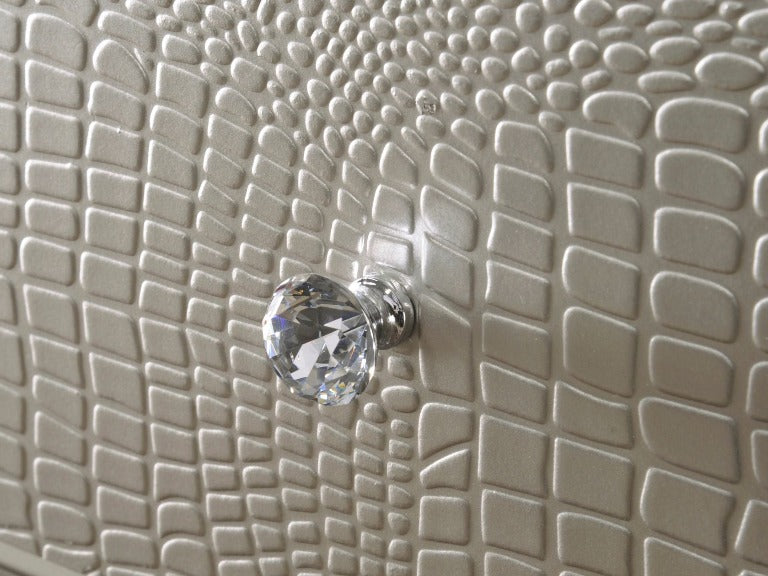 This glamorous bedroom collection features an embossed crocodile finish, decorative knob hardware, and contemporary clean lines. The centerpiece of the collection, the stunning bed, has a diamond tufted headboard surrounded by LED back lighting. Storage pieces have durable dovetail drawers with metal glides.