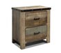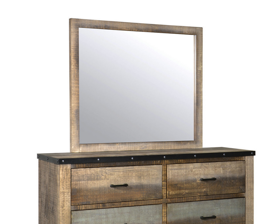 The rustic style of the Sembene bedroom is designed perfect for urban or coastal dwellers. Rough sawn planked solid wood construction group. Tops and bed cap rails are framed with metal edge band with hand applied nailheads. Multi tonal effect of sand, brown and blueish gray, replicating recycled wood look. Finished drawer boxes with brown felt-lining in all top drawers to safely store jewelry or treasured keepsakes. Wire management cord access in nightstand top drawer. Drawers feature dovetailing, full extension drawer glides and black finished hardware.