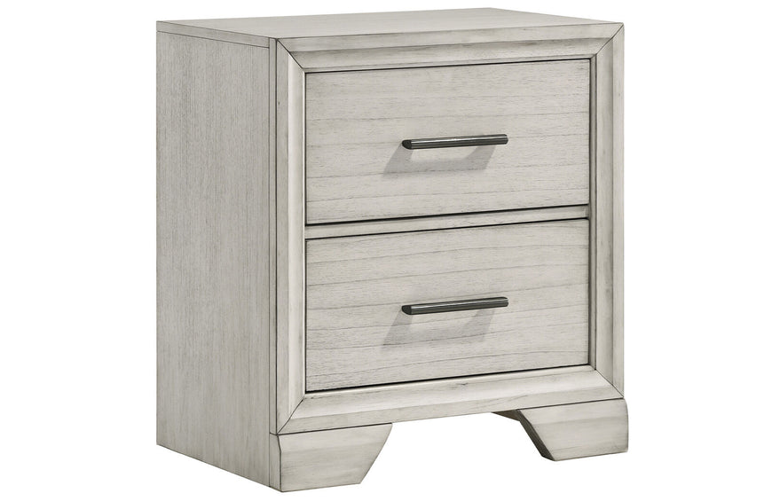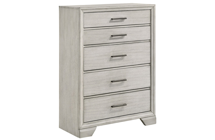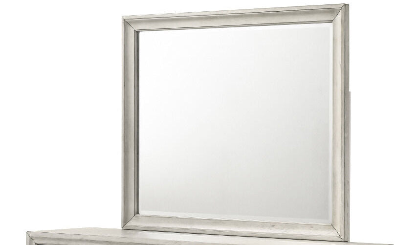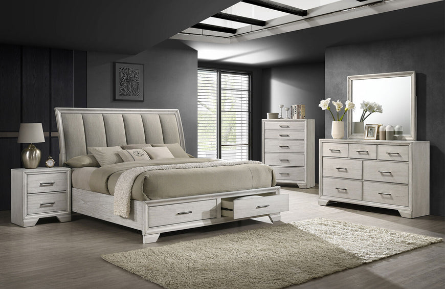This bedroom set offers a sleek and stylish update to any space, featuring a white mist finish that commands attention while maintaining a sense of warmth and coziness. The bed stands as the stunning centerpiece, with its high, padded headboard upholstered in a plush fabric that invites relaxation and comfort. Flanking the bed are matching nightstands, providing convenient access to storage and display space. The set is rounded out with a spacious dresser, accented with a broad mirror that adds depth and brightness to the room. This set includes headboard, footboard, rails, dresser, mirror, and nightstand.