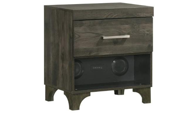 Complementing the bed are the thoughtfully designed storage pieces, including a dresser and chest that boast a clean-lined, ash-grey finish, reflecting the epitome of contemporary chic. The nightstand, a standout in functionality, features a built-in Bluetooth speaker system, seamlessly integrating entertainment with relaxation. Connect your device and envelop your room with your favorite sounds, enhancing the experience of comfort and convenience.