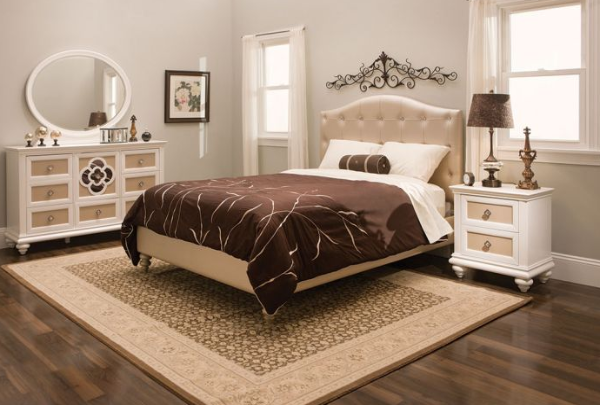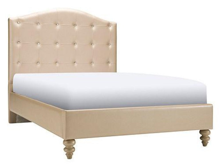 This bedroom set, with its upholstered headboard and base as the centerpiece, is both sophisticated and whimsical. From the bulbous hand-carved legs to the crystal accents in the upholstery to the repeating clover-shapes, this is a collection that will set your child's bedroom apart. The neutral colors creamy white and soft beige allow you to add to create a dream room. This set transitions perfectly from little ones to teenagers, allowing the flexibility to change a room as a child's tastes change, all the while have the quality pieces that grow with your child. Mattress and boxspring sold separately.