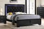 Introduce a bold touch of glam into your space with this gorgeous black finished bed. The LED backlit bed is perfect for the daring types with its velvety upholstered headboard and chic crystal button tufting. The footboard and drawer fronts are adorned with textured panels, adding to the striking look. With crystal-like drawer pulls, dark color and sleek lines, this bed will create an impressive dark glam feel in your bedroom.