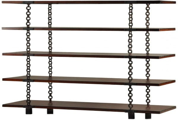 A unique application of metal chained supports on a 5 shelf bookcase dark walnut finish