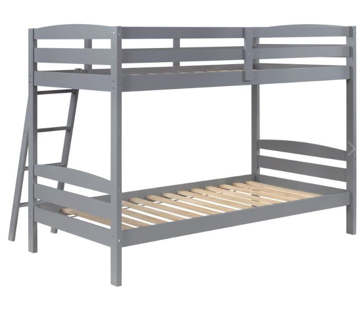 Double the sleeping space in your child's bedroom or a guest room with a modern twin bunk bed. Perfect for two, it includes a modern grey finish over wooden construction for a clean look that blends into surrounding decor with ease. The bed features gently arched head and footboards, each with an open, slatted design. The upper bunk includes safety rails and a ladder for easy access. This bunk bed is the perfect upgrade for a kid's bedroom, offering a great place for a sleepover with friends or easing space concerns in a room shared by siblings.