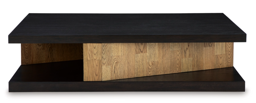 This sculptural coffee table is a perfect blend of contemporary design and relaxed living. Its clean-lined design, contrasting finish and attention-grabbing details take your decor to the next level. The cantilevered top, supported by angled plinths, adds a touch of modern elegance. Need to rearrange for a gathering? No problem. Built-in casters make it a breeze to move this table to any spot for cocktails, morning brew or lively conversation.