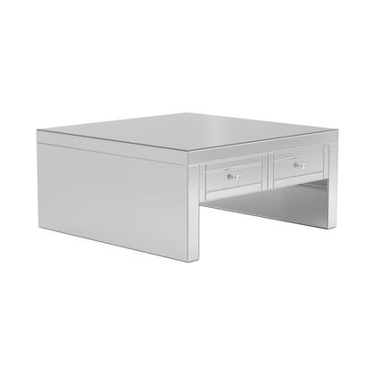 Beautifully crafted with a clean silhouette, this contemporary coffee table is a step above the rest. Elegant and ultra-glam, this table is adorned with silver mirror panels for a bold, modern look. Two faux drawers with crystal knobs add a decorative element to its dazzling design. The expansive, square tabletop offers plenty of surface space for everything from board games to scrumptious spreads of snacks. Pair this piece with matching end tables to bring your space together in spectacular style.