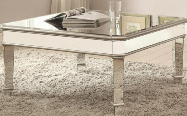 Go for that glamorous look in your loving room with the square mirrored coffee table. Beveled edges and squared legs give you an elegant look with lots of shine to brighten your space.