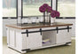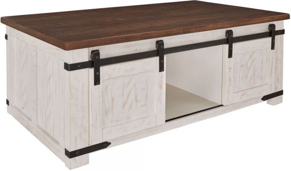This coffee table is expertly crafted with a distressed vintage white finish and contrasting aged natural pine tabletop. This generously sized coffee table combines a look you'll love with the storage you need. Sliding barn doors on both sides hide easy-access storage cubbies perfect for magazines, throws, board games and more. An open shelf in the middle provides more storage or room for decorative items. This attractive table blends rustic and natural style while lending a unique feel to your home.