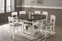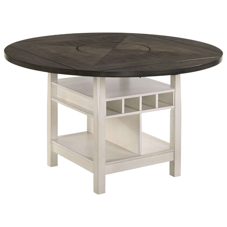 Bring a touch of that contemporary aesthetic to your dining or bar area with this counter height table and chair set. Characteristics of this striking collection include clean straight lines, an intense chalk and grey finish, and flared back legs. The table features a convenient fold out leaves that expand the square table to a round diameter of 60 inches. Use the two shelves below for showcasing decorative pieces and the wine storage compartments to store your most treasured wines. The chairs in this set have been designed with straight lines and flared back legs. Relax on the comfortable upholstered faux leather seat while enjoying dinner with friends and family. Make this table and chair set the focal point of your refined dining room.