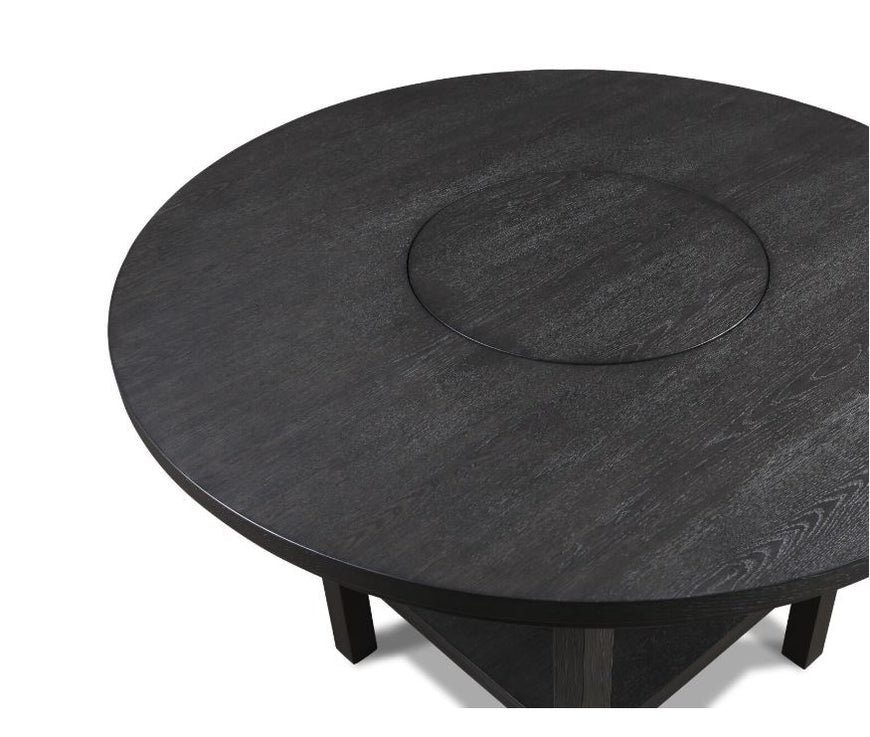 Elevate your dining experience with this contemporary dining group, where modern design meets rustic charm. Crafted with a rich, dark finish, the 54" round-top table offers ample room for both intimate dinners and festive gatherings. The subtle grain detailing on the table's surface adds depth and character, while the shelf base ensures stability and longevity. Complementing the table are the sleek, slat-back chairs, designed for comfort and style with their plush upholstered seats.