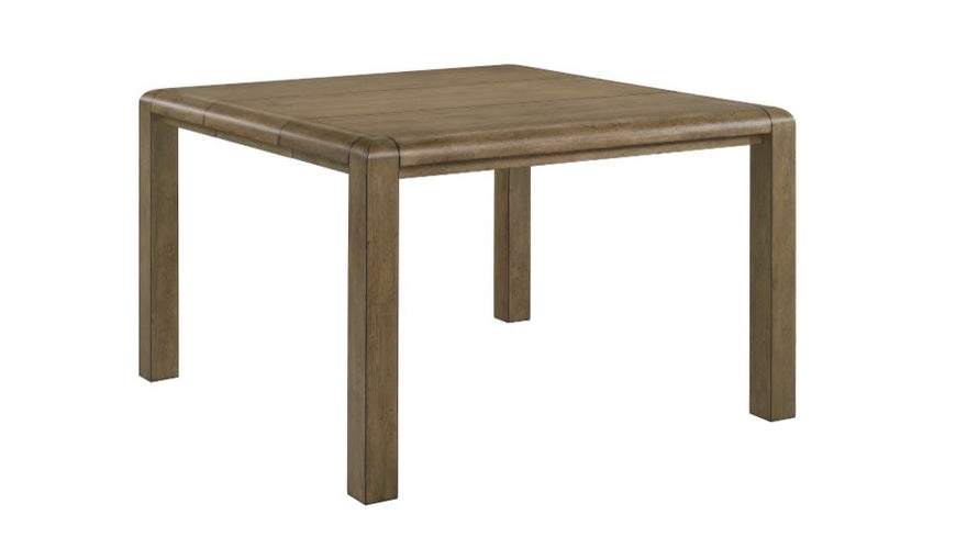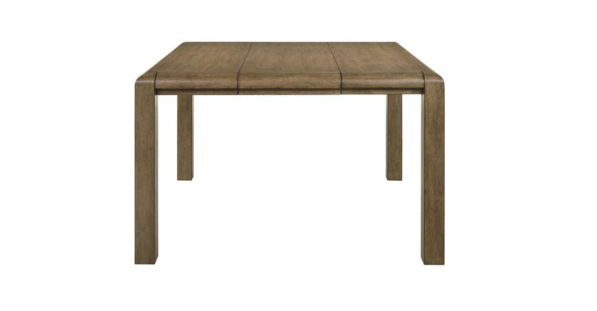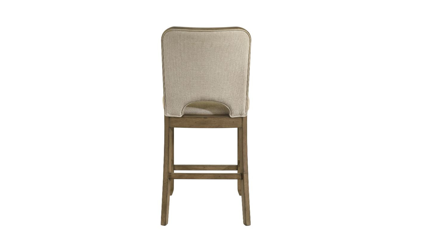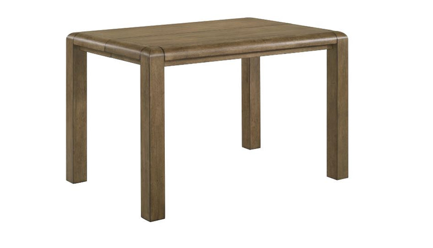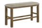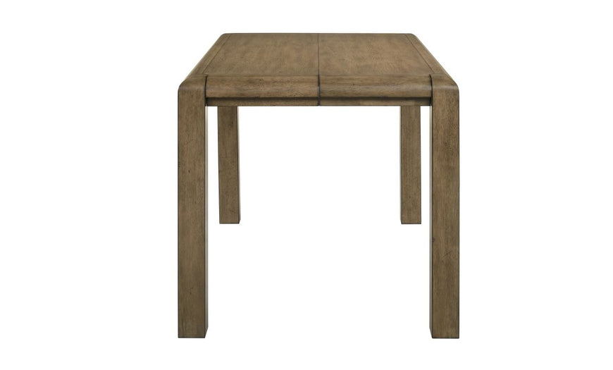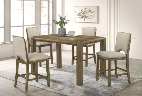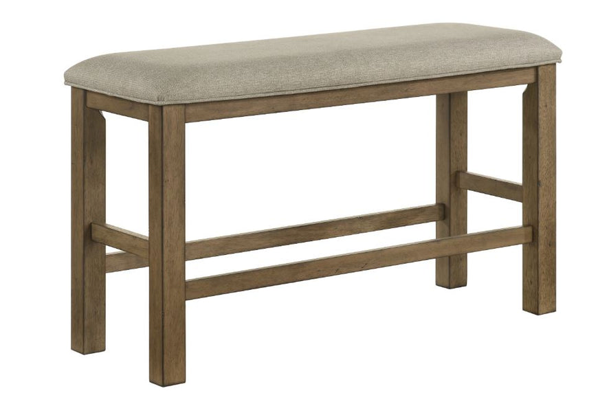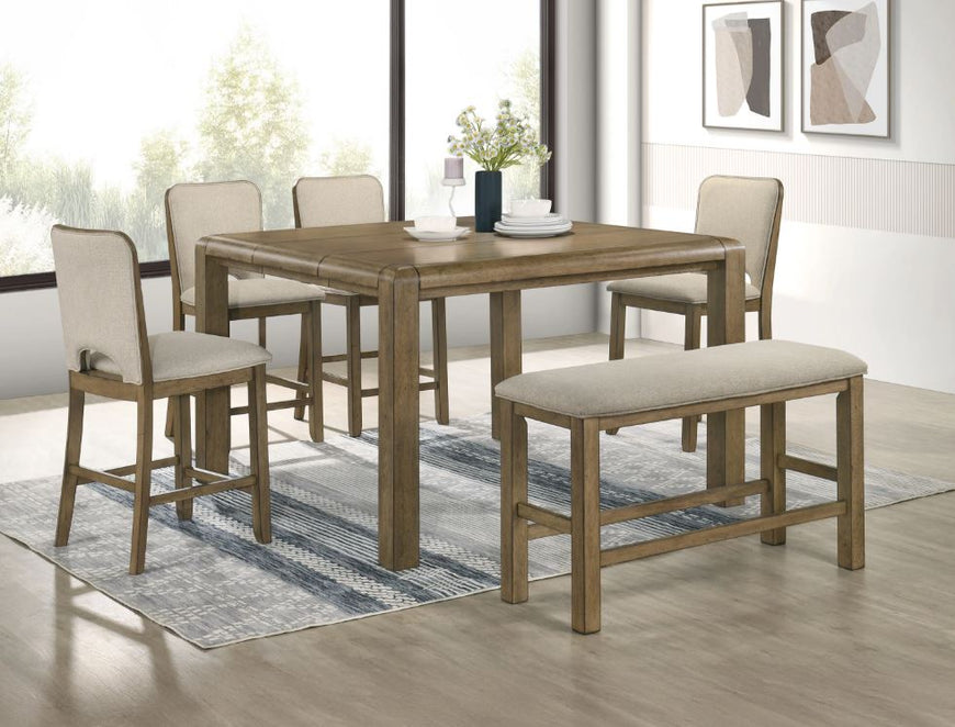 Warm and inviting, this counter height dining group brings a natural charm to the home with its rustic wood tones and clean, understated lines. The rectangular table features a subtly rounded edge and a durable, plank-style top that extends to accommodate extra guests, making it ideal for both everyday dining and special gatherings. Upholstered chairs offer padded seating in a soft, neutral fabric that enhances comfort while complementing the warm wood finish. The design strikes a balance between casual elegance and practical versatility, creating a welcoming atmosphere that is perfect for modern family living. Bench Sold Separately.