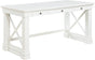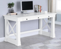 Designed to make a crisp and clean impact, this transitional writing desk in an antique white finish stands out in any space. Subtle design details along the sides of the open legs gives this desk modern flair. Crafted of poplar, MDF, and ash veneer, the clean lines feature three drawers for ample storage. Study or write in style with the minimalistic design and fresh personality. Black hardware pulls pop against the bright finish and make for a stunning visual. This item is a Floor Sample Special.
