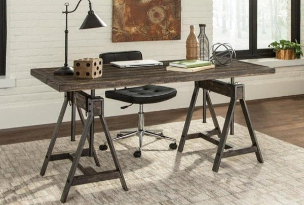 The metal frame is finished in a hand-brushed weathered gunmetal, with the desk in a burnished cognac color. This desk is height-adjustable in two-inch increments, so your dreams and ideas are free to rise to new heights at this writing desk.