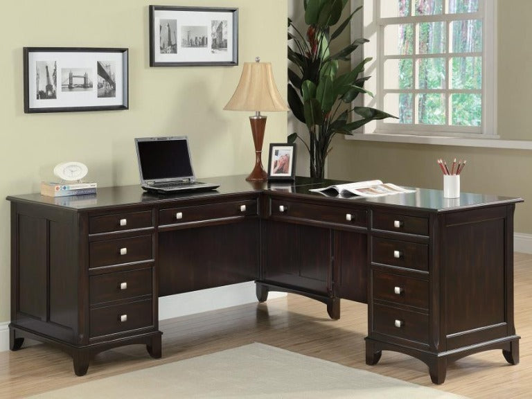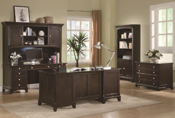 It's time to incorporate a workspace into your every-day life. It's time to be completely comfortable while computing and accomplishing daily tasks. The Garson Home Office features functional pieces that offer an appealing traditional design with a dark brown finish complemented by light brushed accents. Easy to open glide drawers, wire management in the desks, CPU storage in the credenza, and task lighting in the hutch all add to the ease of use you will appreciate as you stay organized and productive at home. Price is for the Desk. Additional pieces sold separately.