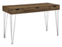 Perfect for a modern farmhouse home office or library comes this classy, yet rustic writing desk. Designed with a neutral rustic brown oak finish throughout the tabletop, this writing desk blends well into many decor styles and color palettes. Its rectangular tabletop shape rests elegantly on chic thin metal legs that lend a retro-inspired flair and an open and airy look. This writing desk also offers plenty of hidden storage space with one long center drawer and two side drawers, each with cutout handles that give a flush, clean look. Each three-pronged steel leg offers a glam touch with a shining electroplated chrome finish.