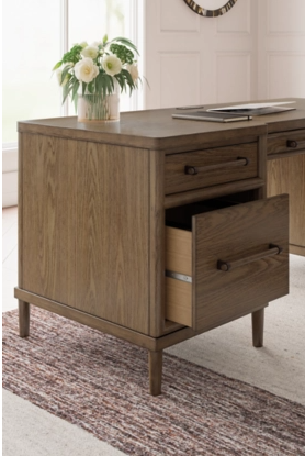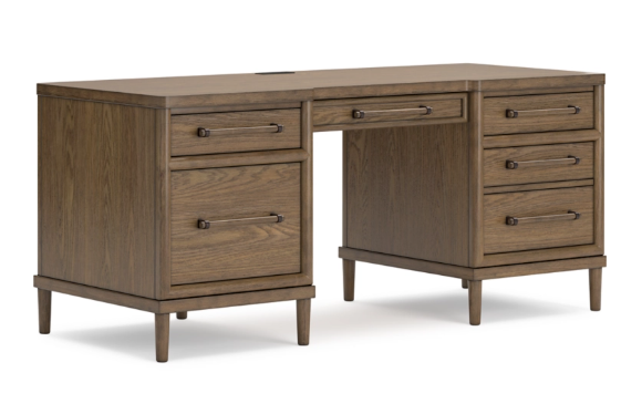 Give your mid-century modern decor that finishing touch with this home office desk. Spacious drawers with unique wooden drawer pulls enhance the design with stunning style. This desk takes minimalism to the max. Made with hardwood solids, oak veneer and MDF substrate Brown oak finish Wood and metal drawer pulls...