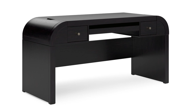 Inspired by art deco design, this softly shaped home office desk makes a lasting impression in a simply stunning way. Its magnificent curved silhouette is enhanced by a rich layered black finish on the textured wood grain surface. Complete with ample storage, a pull-out keyboard tray and USB charging, this is the all-in-one piece you’ve been looking for to elevate your contemporary workspace decor.