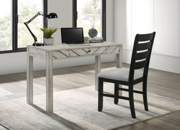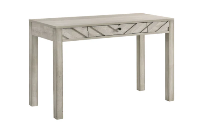 Embrace rustic charm and timeless elegance with this beautifully handcrafted workspace essential. Designed with a minimalist silhouette and a distressed white finish, this piece effortlessly blends vintage aesthetics with modern functionality. The unique chevron-patterned drawer front adds a touch of artisanal craftsmanship, while the spacious surface provides the perfect setting for work, study, or creativity. Sturdy and durable, it is built to complement both farmhouse and contemporary interiors, making it a versatile addition to any home or office. Elevate your productivity with a design that balances warmth, character, and practicality in perfect harmony.