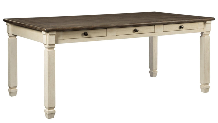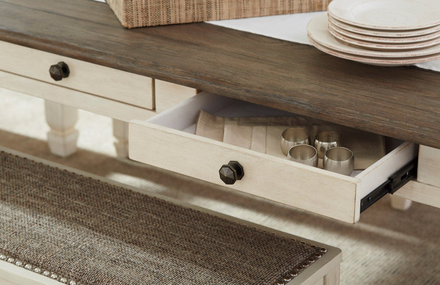 The beauty of this dining table is something to savor. A two-tone textural finish gives this rectangular dining table with plank-effect top a double helping of charm. Six drawers built into the table apron allow you to keep placemats, napkins and utensils right on hand.