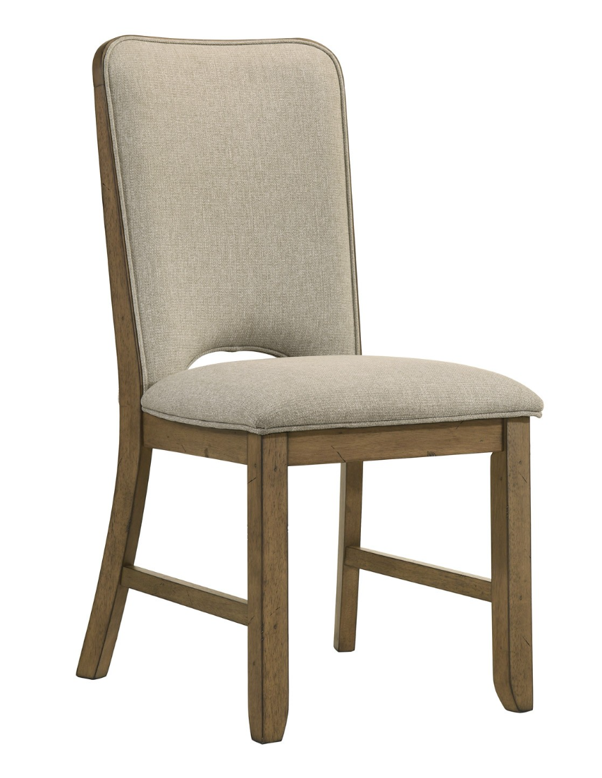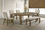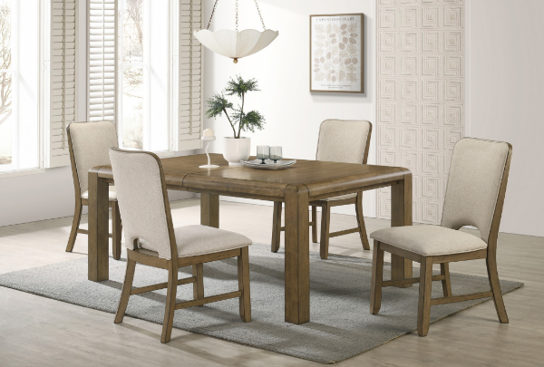 Warm and inviting, this dining group brings a natural charm to the home with its rustic wood tones and clean, understated lines. The rectangular table features a subtly rounded edge and a durable, plank-style top that extends to accommodate extra guests, making it ideal for both everyday dining and special gatherings. Upholstered chairs and bench offer padded seating in a soft, neutral fabric that enhances comfort while complementing the warm wood finish. The design balances casual elegance with practical versatility, creating a welcoming atmosphere perfect for modern family living.