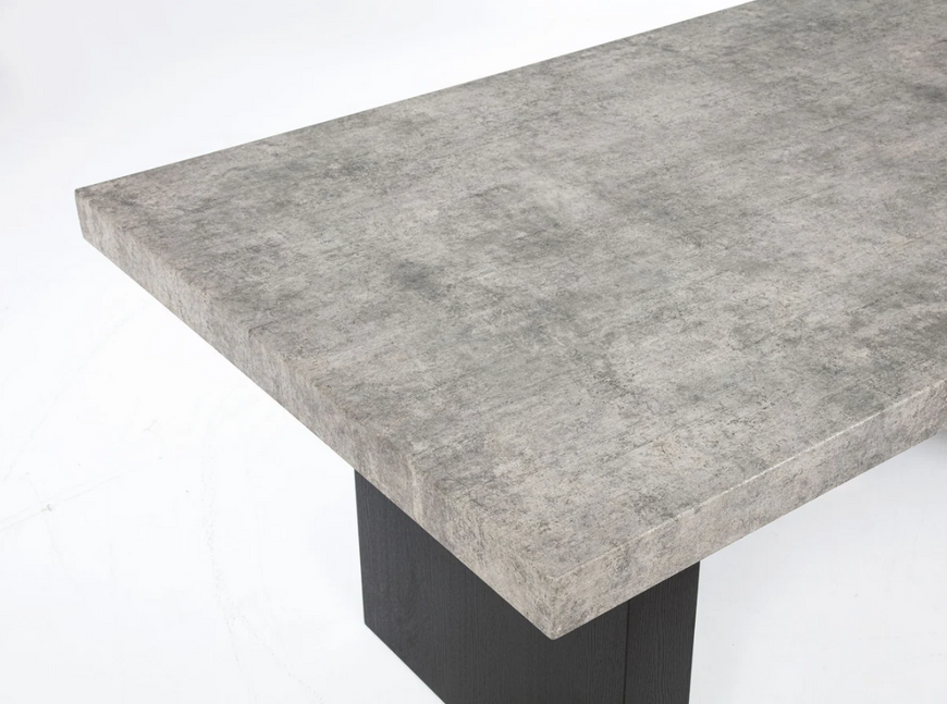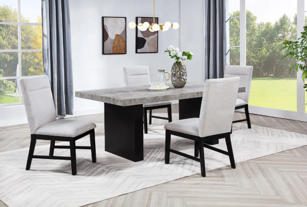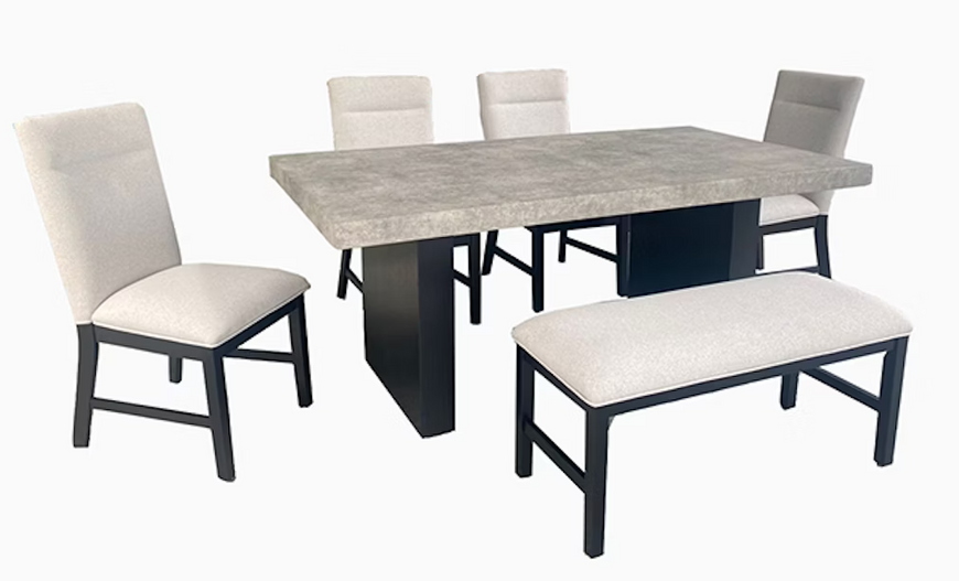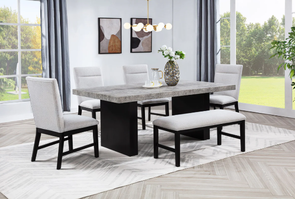 Elevate your dining experience with this contemporary ensemble that perfectly balances style and functionality. Featuring a bold, concrete-inspired tabletop and sleek supports, this centerpiece is both striking and durable, ideal for modern living. The complementary seating combines plush upholstery with robust frames, delivering unmatched comfort and elegance. The addition of a bench adds versatility, making it perfect for casual gatherings or formal meals. Designed to harmonize with a variety of décor styles, this set blends modern minimalism with everyday practicality, ensuring your dining space is as inviting as it is stylish.