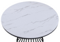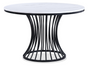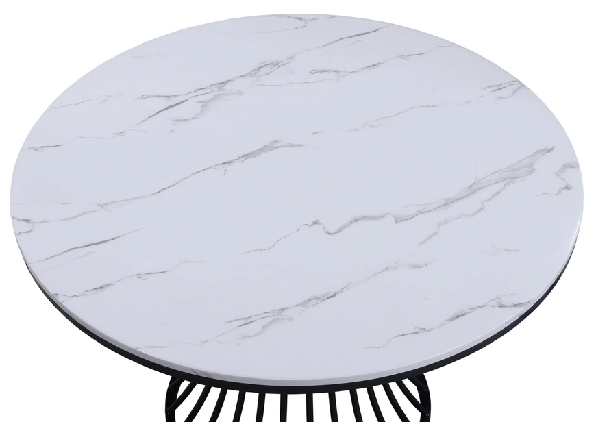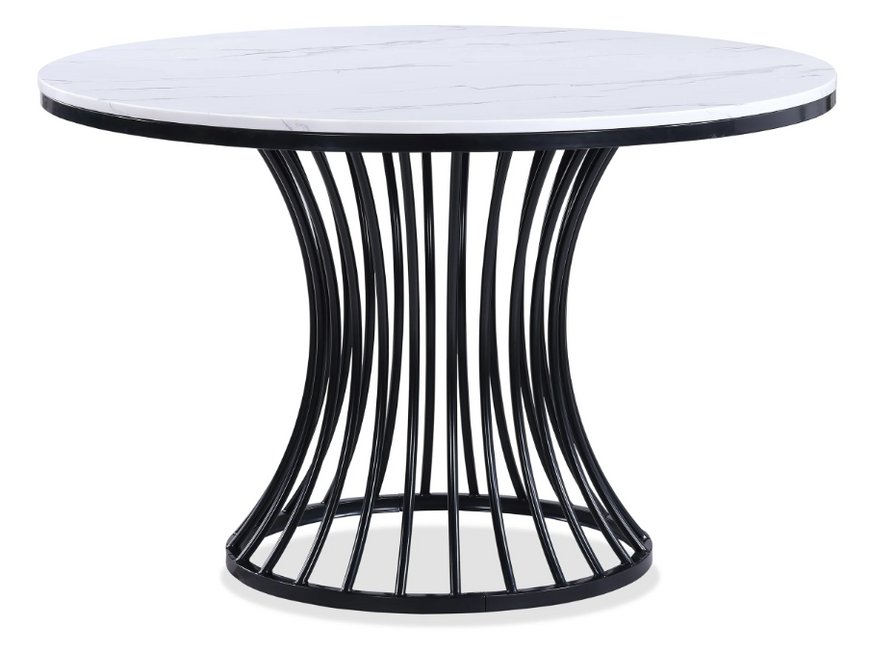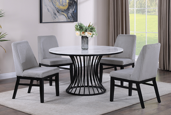 This dining set is a sophisticated blend of contemporary design and artistic flair, ideal for modern homes seeking a touch of elegance. The set features a sleek, round table with a faux marble top that is both beautiful and easy to care for. The table's base is a sculptural marvel, with a dynamic, cage-like structure that is as sturdy as it is stylish. Accompanying the table are plush chairs upholstered in a high-quality, textured fabric, their high backs and cushioned seats offering utmost comfort. The chairs' bold, black frames contrast with the light upholstery, adding a striking visual interest to the set.
