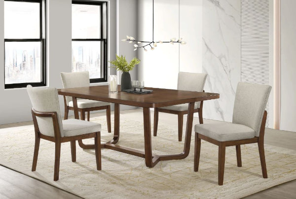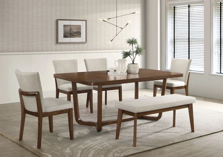 Elevate your dining space with this sleek and sophisticated dining set, designed to blend modern elegance with mid-century inspiration seamlessly. The beautifully crafted table features a warm wood finish and a unique sculptural base, adding a refined touch to any setting. Complementing the table, the gracefully curved chairs and bench that is sold separately boast plush upholstered seats and soft fabric backrests, ensuring superior comfort for every meal. With its clean lines and timeless design, this dining collection is perfect for those who appreciate both form and function, making every gathering a stylish and inviting experience.