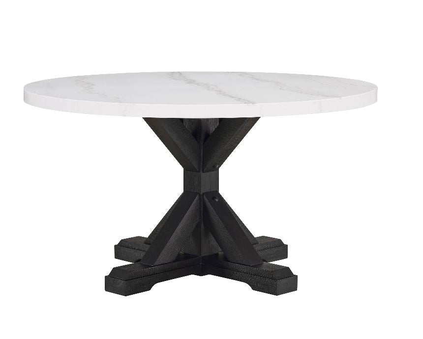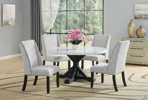 This group's fresh take on a traditional silhouette makes it a great addition to your dining space. The marble top provides an elegant look while being easy to care for. The trestle base is updated in a contemporary charcoal finish. The upholstered dining chairs feature gently sloped wings and a nail-head trim on the back.