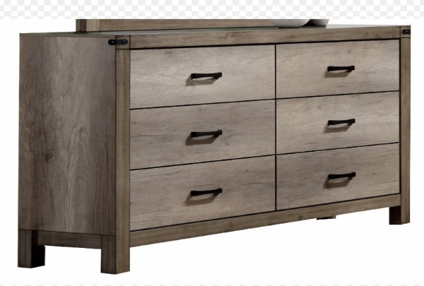 Thi sleek dresser has a light grey finish, a clean frame, and flat drawer panels. This rustic styling dresser features 6 drawers with center metal glides. Black metal bar hardware matches the accents on the top corners of the frame. Pair with the bed in this collection for a stylishly refined bedroom set.