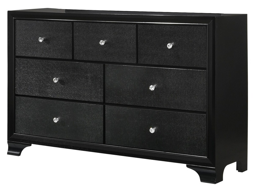 Introduce a bold touch of glam into your space with this gorgeous black finished Chest. With crystal-like drawer pulls, dark color and sleek lines, this Chest will create an impressive dark glam feel in your bedroom.   Dresser 58.4" X 16.4" X 37.3"H