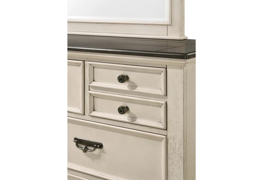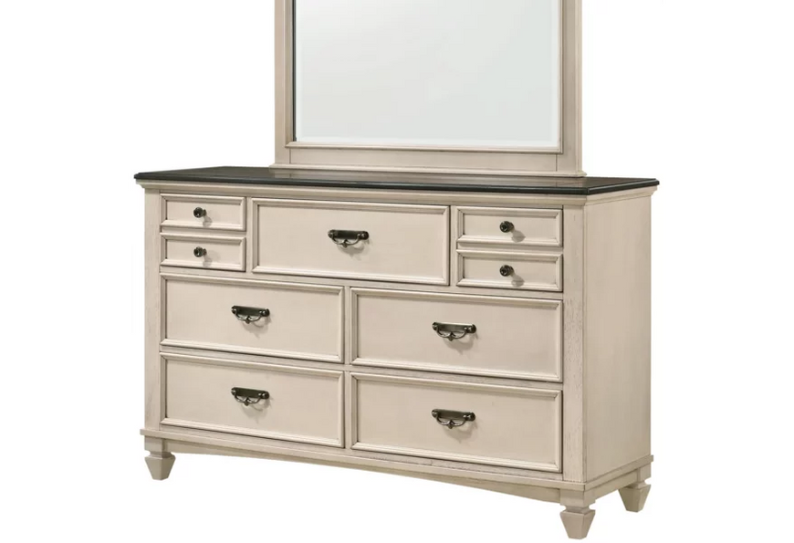 Bring a warm feel to your decor with this cottage style dresser. This piece features a two-tone finish, framed drawer fronts, spade feet, and metal hardware for a tasteful, homey design. Plus, you'll love all of the storage space it provides.
