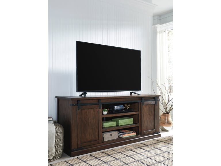 Add a touch of country style to your living area with the Budmore 60" TV stand. It’s visually appealing with the flexibility you need. Adjustable end shelves offer lots of storage, while the two stationary middle shelves are roomy for TV components. Two sliding barn doors can easily be positioned...