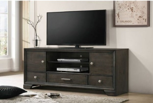 The James Tv Stand will be a great addition to your bedroom or living room. It features two doors, three drawers, and a middle center shelf. The gray color wood makes it perfect for anyone's home.