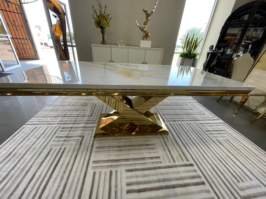 Elevate your dining experience with a stunning 7-piece ensemble designed to infuse your space with glamour and sophistication. Featuring a gleaming faux marble tabletop and radiant gold-finished accents, this set is the epitome of modern opulence with a timeless twist.