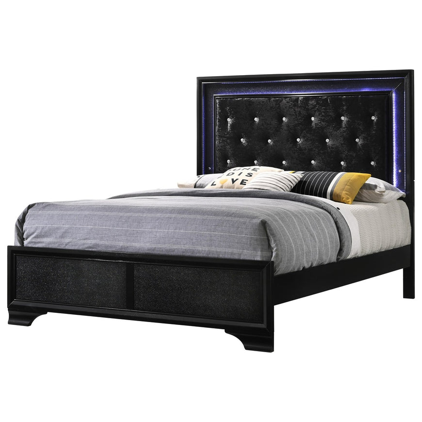 Introduce a bold touch of glam into your space with this gorgeous black finished bed. The LED backlit bed is perfect for the daring types with its velvety upholstered headboard and chic crystal button tufting. The footboard and drawer fronts are adorned with textured panels, adding to the striking look....