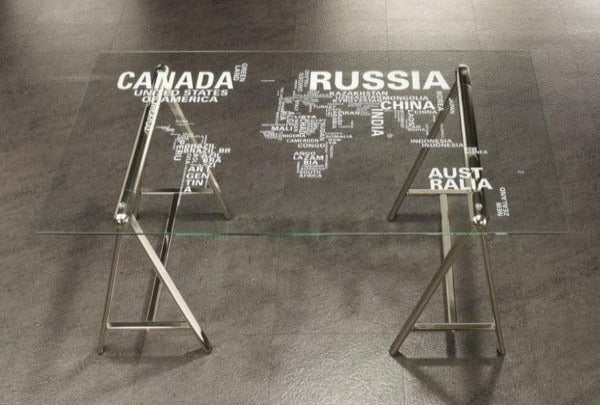 The world is truly at your fingertips with this table desk. Lifted on sturdy nickel legs with stretchers, it has a tempered glass table top for strength and stability. The desktop is printed with a world map in words, offering a cool, modern design to visually please. Enjoy a refreshing contemporary styling and simplicity to outfit your home office or living space.