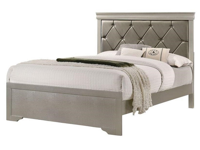 The Amalia collection will energize your bedrooms. Boasting transitional style, this queen panel bed is a chic addition to your master suite or guest bedroom. This bed with a silver finish frame is beautifully designed with an upholstered headboard accented with button tufted details. Use of fine quality wood further adds strength and durability to this modern set. The neutral hue blends with a variety of color schemes.