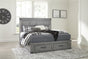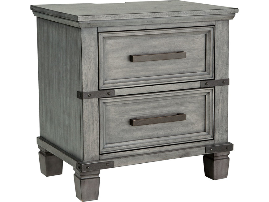 This urban farmhouse styling King set, is made with Acacia solids. Finished with a light weathered gray coloration accented with dark aged bronze bar pulls and metal straps. Dovetail drawer construction with metal ball bearing side glides. Profiled drawer frames, thick profiled top molding, and tapered legs earmark a timeless case design. The tall mansion scale bed features storage drawers on the footboard. The two-drawer nightstand includes a 110V power supply with dual USB charging ports.