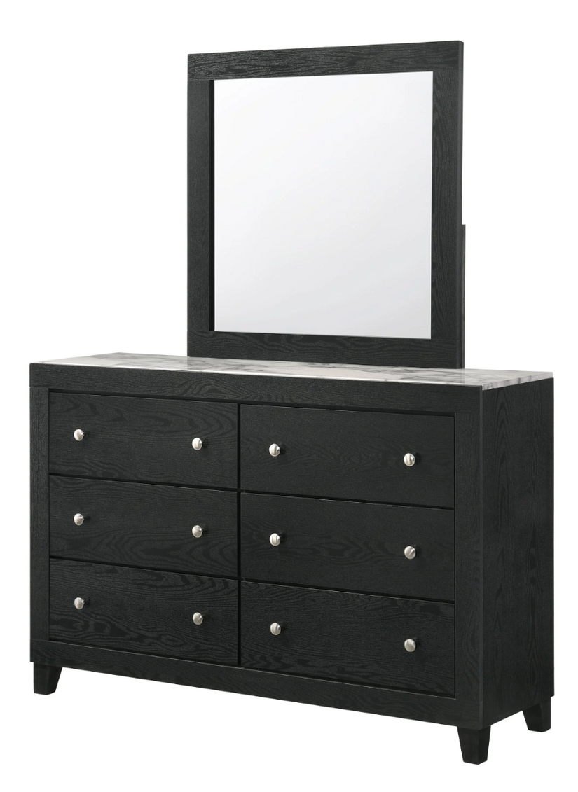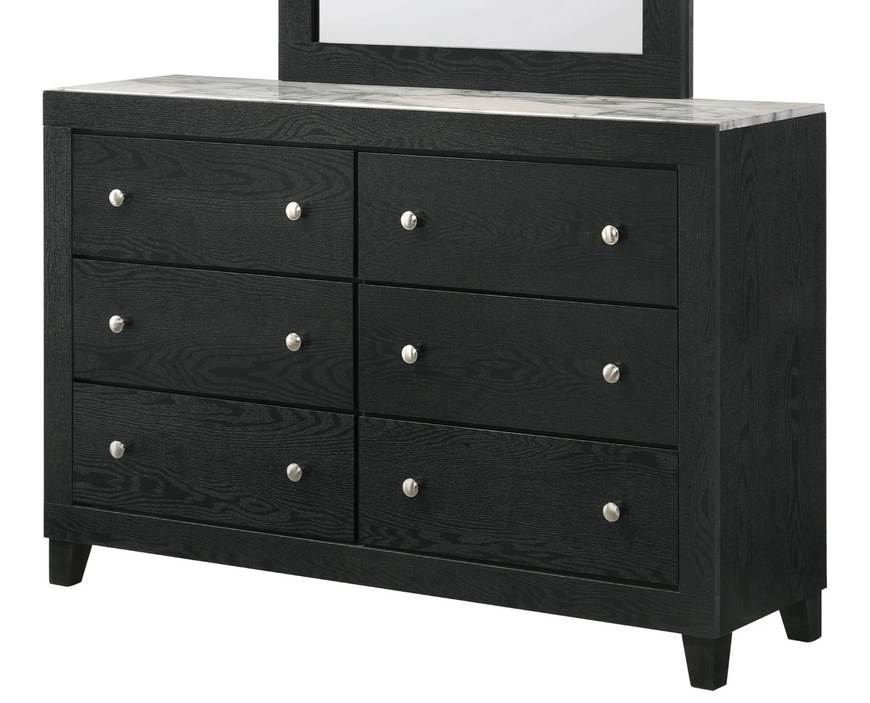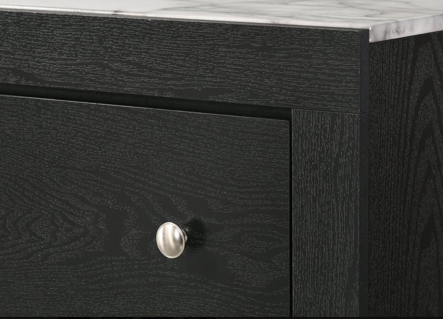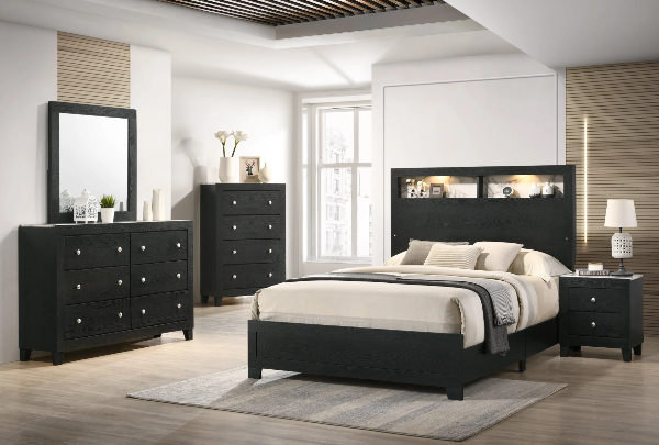 This elegant bedroom collection exudes sophistication with its sleek, dark finish and modern design. The sturdy construction of each piece showcases a rich, textured wood grain, offering both durability and style. The bed, the centerpiece, features a bold, high headboard with built-in shelving and decorative back panels, enhanced by soft illumination for a cozy ambiance. Faux marble tops and sleek knobs accent the case pieces. The harmonious blend of straight lines and minimalistic design ensures this collection will anchor a bedroom with a contemporary yet timeless appeal.