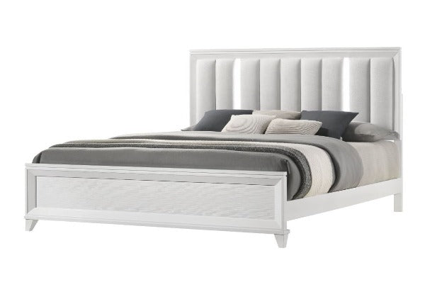 The Cressida will surely make a statement in your bedroom. It features tapered front feet, a low footboard, an upholstered cushion with LED lights on the headboard, and comes in a white finish. This set will make you fall in love all over again from the led lights to the finish...