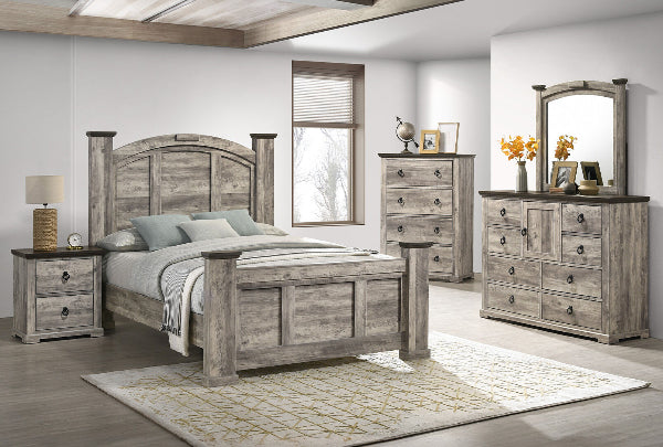 Immerse yourself in the rustic charm of this exquisite bedroom collection, where timeless design meets masterful craftsmanship. Every detail is thoughtfully curated to create a warm, inviting ambiance, blending heritage-inspired aesthetics with modern functionality. The set boasts a beautifully weathered finish, enhancing its rich character and effortless adaptability to any decor style. Each piece is meticulously crafted from premium materials, featuring sturdy, long-lasting frames, ample storage solutions, and elegantly detailed hardware. Designed to be both visually stunning and highly practical, this collection transforms your bedroom into a serene retreat of comfort and sophistication. Set Included: Headboard, Footboard, Rails, Dresser, Mirror, Nighstand. (Chest is SOLD SEPARATLEY)